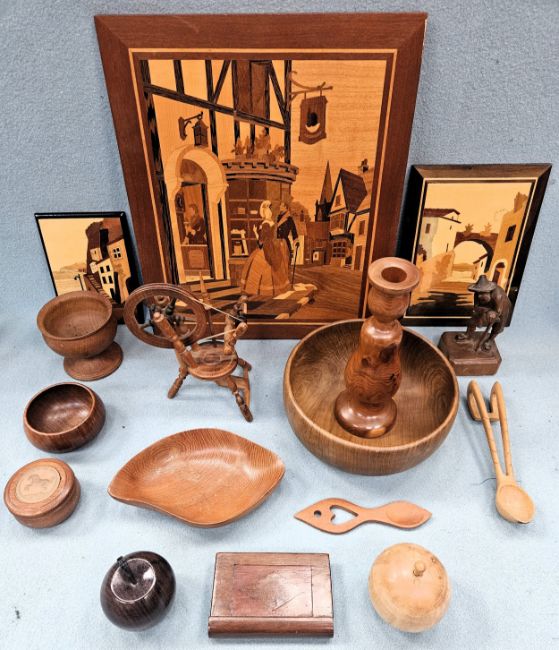 Quantity of various wooden items Inc. book form secret box, inlaid panels, hand turned pieces Inc. fruit, Oriental woods